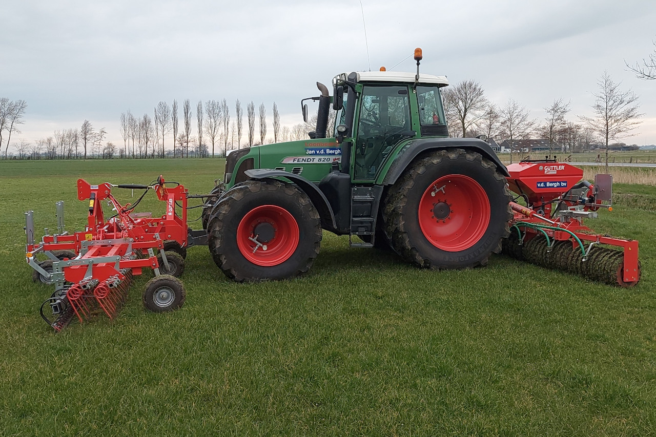 Doorzaaien doen we met een Güttler van 6 meter breed. In de fronthef hangt een zware wiedeg met egalisatiebord. En in de achterhef wordt er voor de zware Güttler-wals pneumatisch volvelds gezaaid.