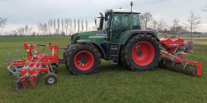 Wij kunnen zaaien in combinatie met voorin de fronthef een kopeg, achterin een rotorcultivator en daarachter de zaaimachine. Doordat wij kopeggen en zaaien tegelijk, kunnen wij in 1 werkgang uw bestaand grasland beluchten, kleine oneffenheden er uithalen en zaaien. De zaaimachine zaait vol velds. Ook kunnen wij met deze combinatie granen zaaien.