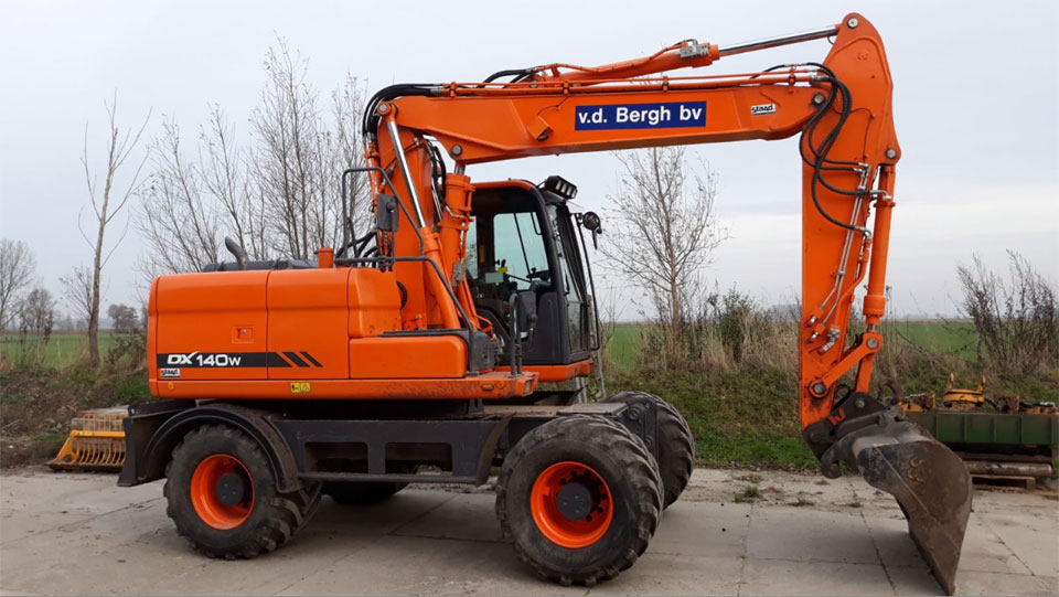 Deze kraan is 14 ton en heeft stalen brede banden van 65 cm breed. Wij hebben er diverse bakken bij, waaronder een palletvork, sorteergrijper, stenenklem, puin-, 30 cm-, 80 cm-, 180 cm- en kantelbak.