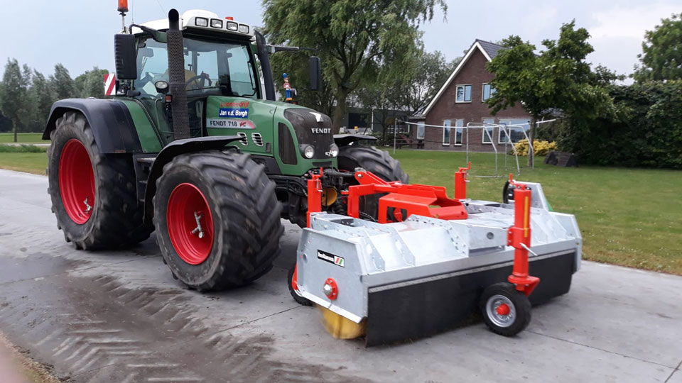Door middel van onze veegmachine en een rubberen schuif in de fronthef kunnen wij wegen en erven schoonmaken. Wij kunnen eventueel ook sproeien met water.