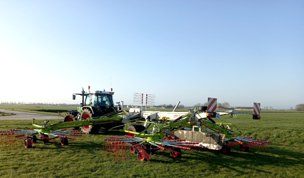 Harken doen we met een 4-elements hark met middenafleg, van 12,7 meter werkbreedte. Hierdoor krijg je egale wiersen, zonder "proppen". Daardoor kan de opraapwagen / pers / hakselaar een hogere capaciteit halen, zodat dit weer een gunstige invloed heeft op de prijs per hectare. Door elektrische hoogteverstelling kunnen we schoon harken. Dus minder ruw as in kuilvoer.