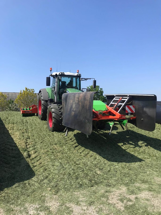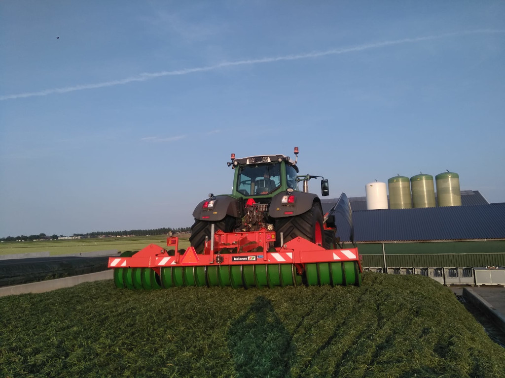 De kuilverdeler heeft een grote capaciteit, hierdoor is de kuil snel vlak gedraaid. Dit heeft als voordeel dat je meer tijd hebt om de kuilbult goed aan te rijden. Omdat de kuilverdeler in de fronthef hangt, hebben we achter in de hef een verdichtingswals van het merk Holaras, met een gewicht van 5 ton. Hierdoor hebben we een totaalgewicht van ruim 16 ton, waardoor de kuil enorm verdicht wordt.