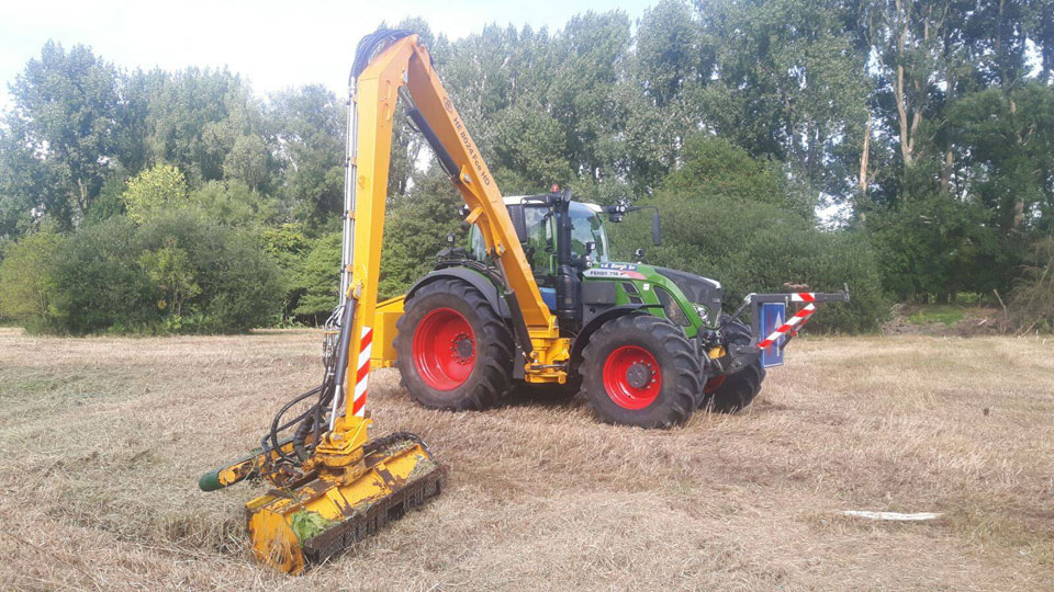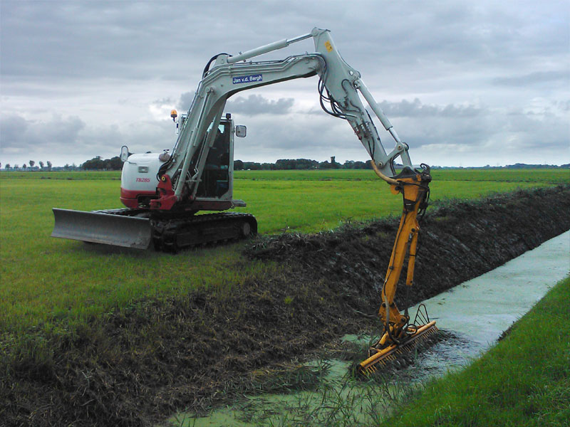 Klepelmaaier aan lange arm om lange taluds, over omheiningen en vlak boven het water te klepelen. De klepelmaaier heeft een reikwijdte van ± 8 meter en een werkbreedte van ongeveer 1,60 meter. Deze is voorzien van een draaikop en afvoerband. Deze klepelbak heeft een grote slagkracht, want deze werkt met een hogedruk van ± 400 bar! Daardoor heeft hij een zeer grote capaciteit.