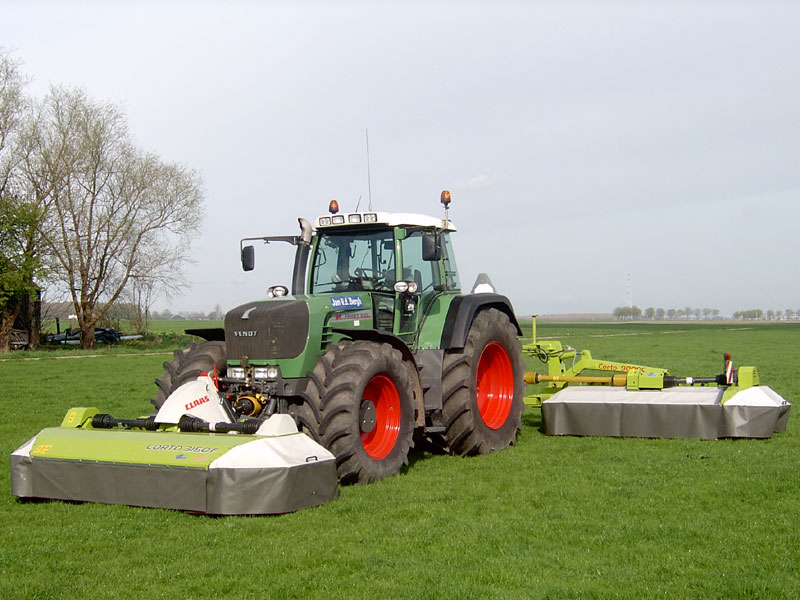 Een Fendt 930 van 310 pk wordt voor de triplo-maaier gebruikt en staat voor de mestpomp bij het sleepslang bemesten, zodat de pomp een extra hoge capaciteit heeft.